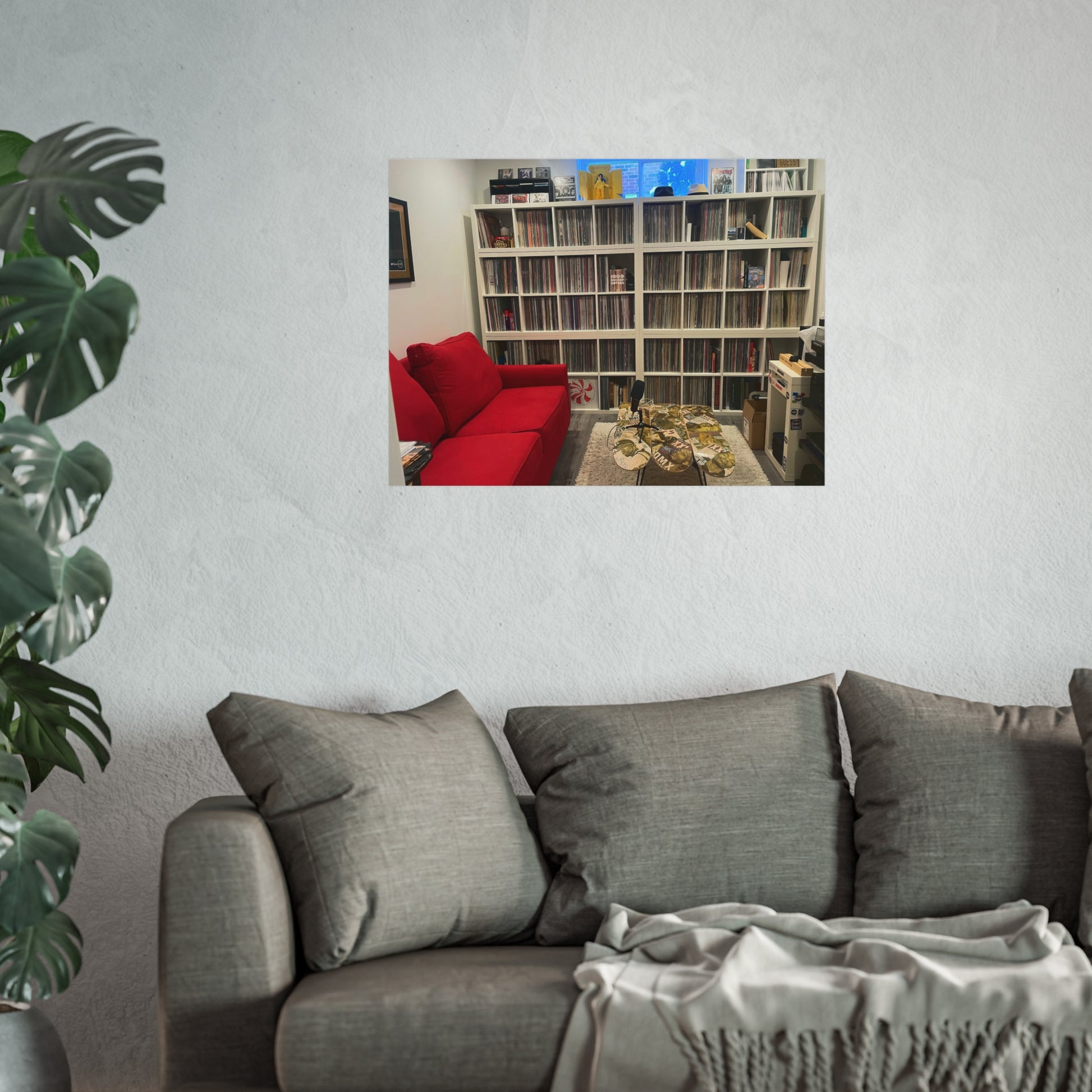 “Vinyl Wall — Red Couch” introduces a subtle pop of color against the structure of a record-lined wall. The contrast between the warmth of the couch and the order of the collection gives the image a relaxed, human feel—a room meant to be used, not just admired.